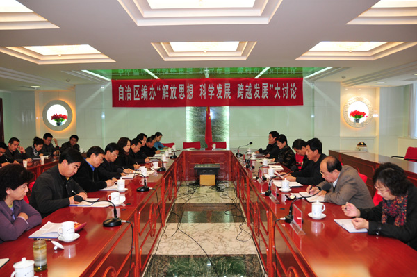 按照自治区学习实践活动领导小组办公室《关于开展“解放思想 科学发展 跨越发展”大讨论活动的通知》要求,11月18日下午,自治区编办组织全体党员和干部职工集中进行“解放思想 科学发展 跨越发展”大讨论。自治区第七指导检查组何建国组长、李洪山副组长和霍丽、李宏建、李增民等同志莅临编办参加了讨论会。